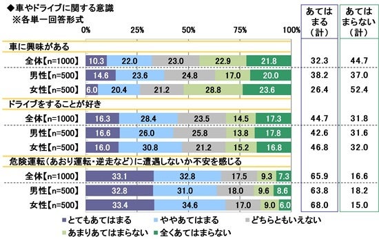 全回答者1,000名に、車やドライブに対する意識について、それぞれどの程度あてはまるかを聞きました。