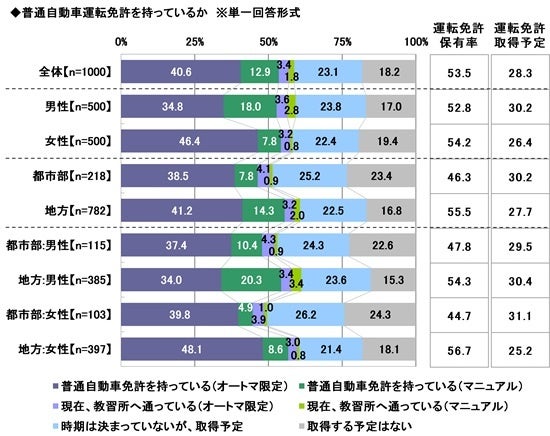 また、「現在、教習所へ通っている(オートマ限定)」は3.4%、「現在、教習所へ通っている(マニュアル)」は1.8%、「時期は決まっていないが、取得予定」は23.1%で、合計した『運転免許取得予定』は28.3%でした。