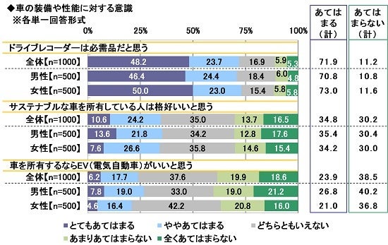 全回答者1,000名に、車の装備や性能に対する意識について、それぞれどの程度あてはまるかを聞きました。