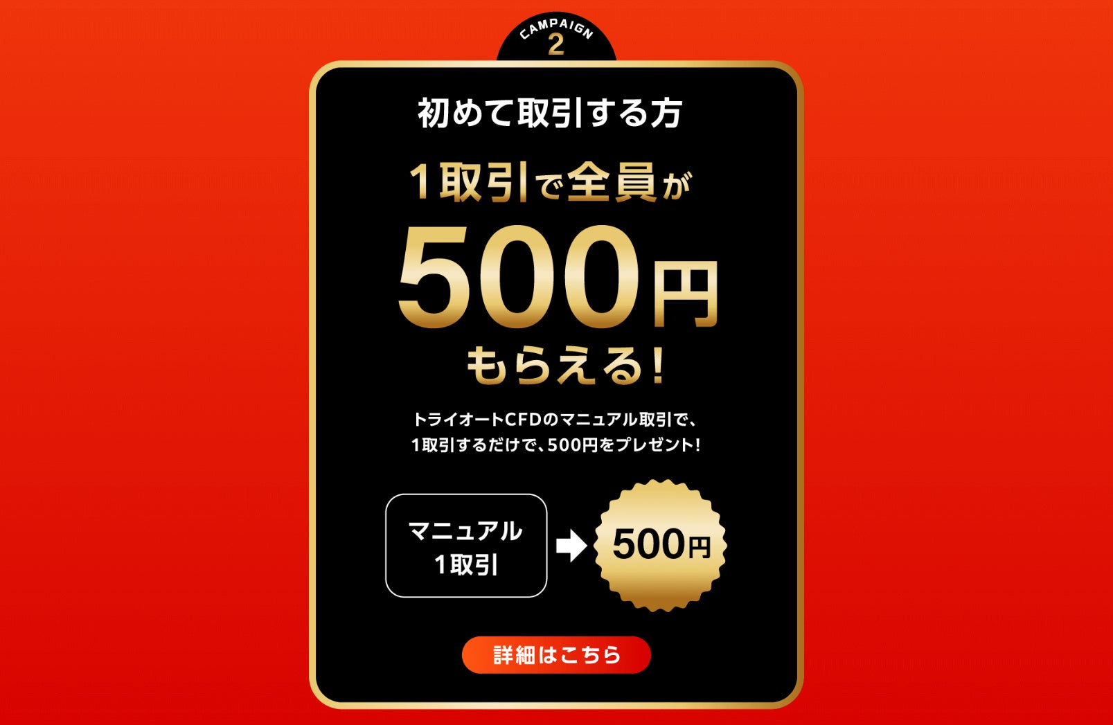初めて取引する方限定でマニュアル1取引を達成すると、もれなく500円をプレゼントいたします。