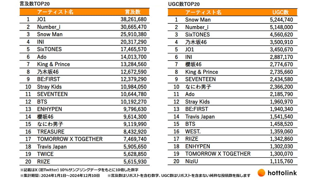 SNSマーケティング支援サービスを提供する株式会社ホットリンク(本社:東京都千代田区、証券コード:3680、代表取締役:内山幸樹、以下ホットリンク)は、X(旧Twitter)のデータを分析し、2024年にX上で話題になったアーティストを調査しました。