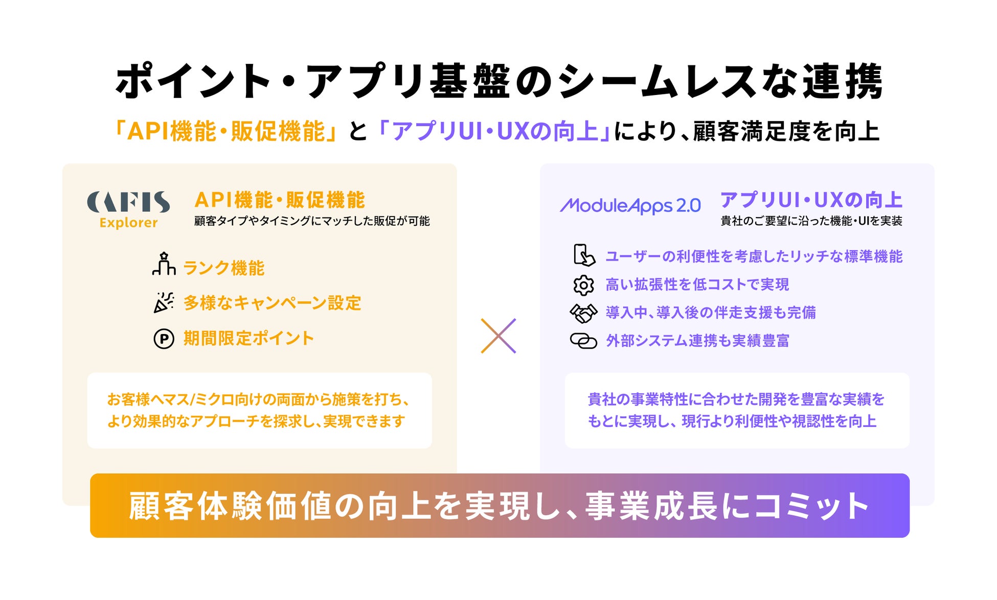 CAFIS Explorerでは、ポイントサービス向上への様々なデジタル施策に必要な販促機能を具備し、ModuleApps2.0はアプリ開発の実績が豊富です。これにより、ポイント販促とアプリUI/UXの両面から顧客満足度を向上させ、クライアントの事業成長を支援します。