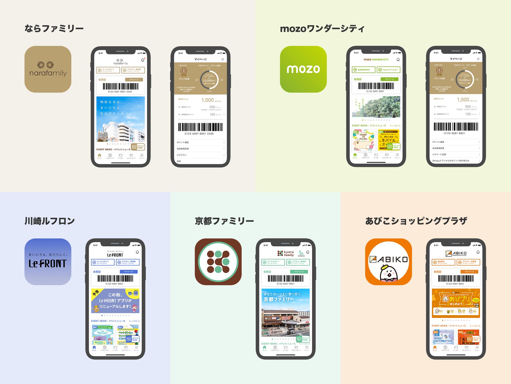 JMFでは、「ならファミリー」と「mozo ワンダーシティ」「川崎ルフロン」「京都ファミリー」「あびこショッピングプラザ」の4施設において異なるポイントシステムを利用しており、且つ「ならファミリー」には公式アプリも存在していない状況でした。