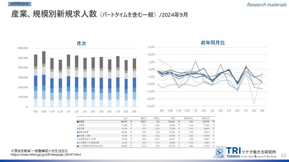 株式会社ツナググループ・ホールディングス(本社:東京都中央区、代表取締役兼執行役員社長:米田 光宏)を母体とする、多様な働き方の調査研究機関「ツナグ働き方研究所(拠点:東京都中央区、所長:大野 博司)」は、官公庁などが発表する労働市場関連のデータをキュレーションしつつ、分かりやすくまとめた「労働市場データレポート」を毎月発表しています。今回は10月下旬に発表された最新データをもとに2024年9月度のレポートについてとりまとめましたのでご報告いたします。