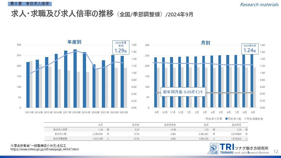 【調査レポート】2024年9月度の有効求人倍率は1.24倍、前月より0.01ポイント上昇