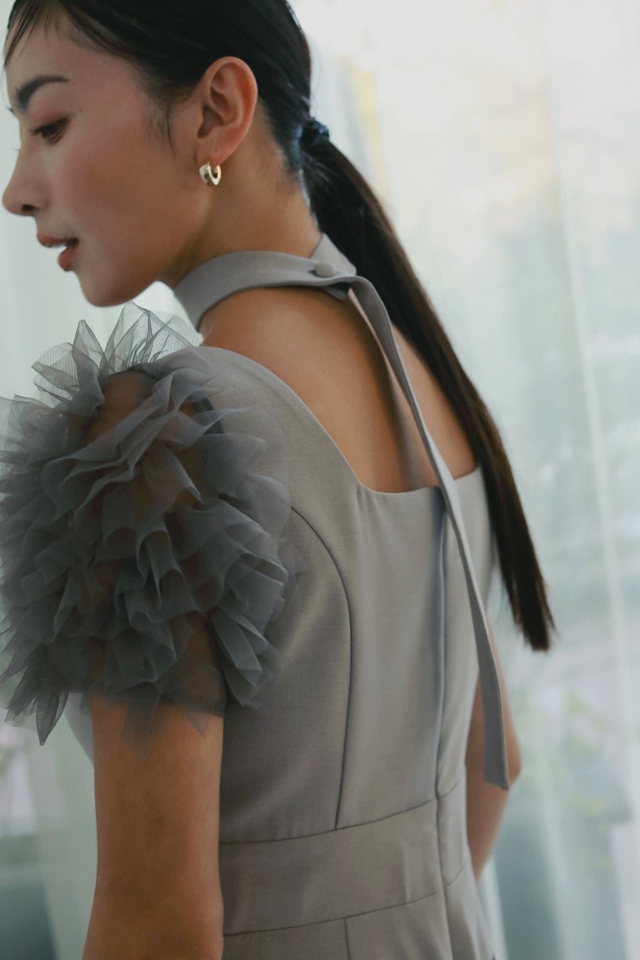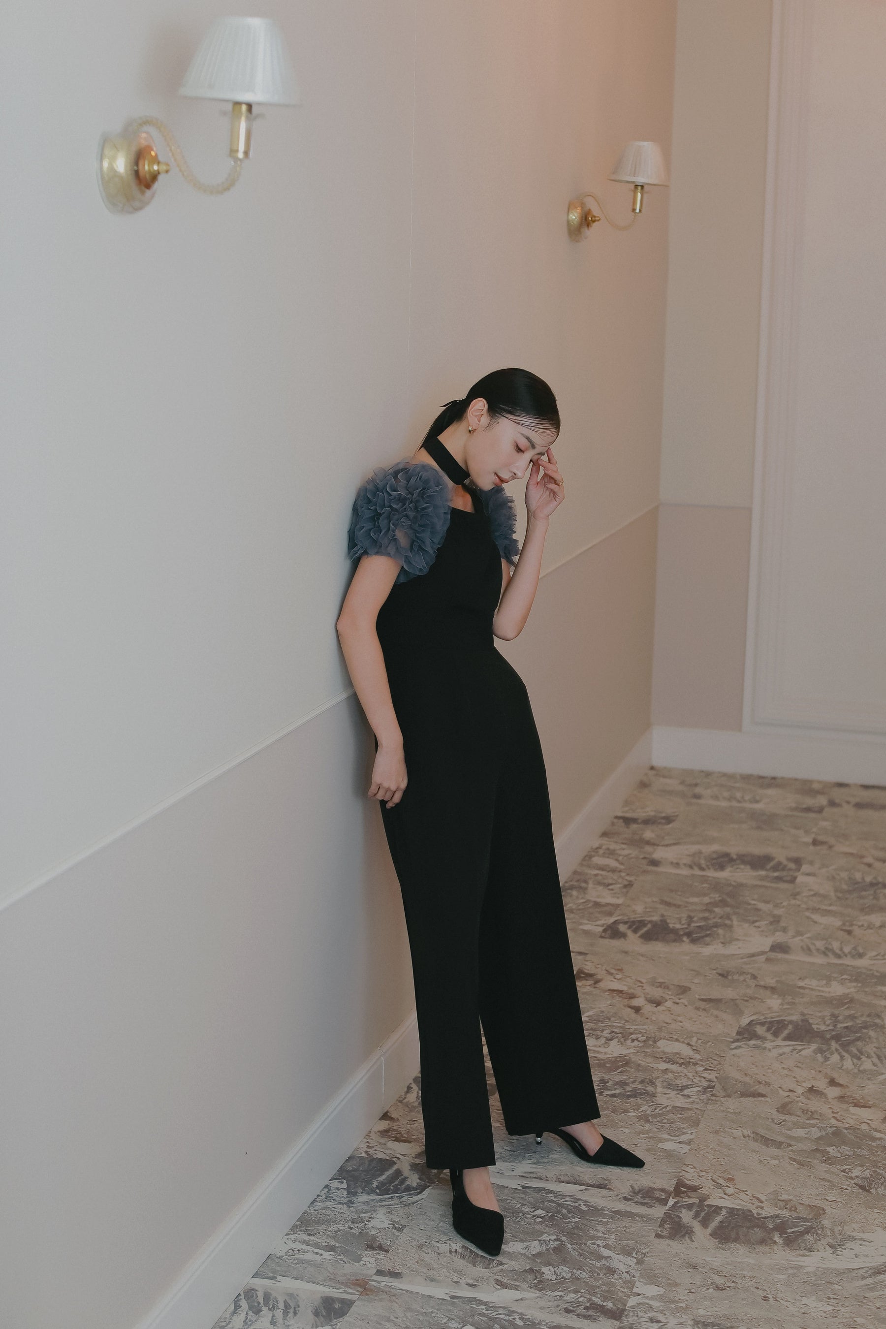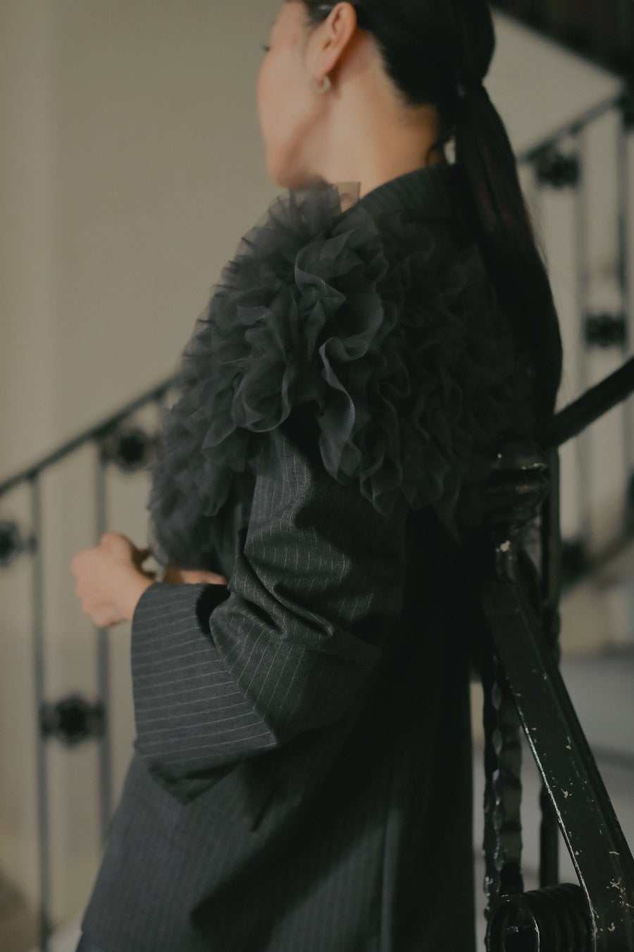 袖のチュールが可憐な余韻を添えながら、パンツスタイルで甘さを程よく引き算、