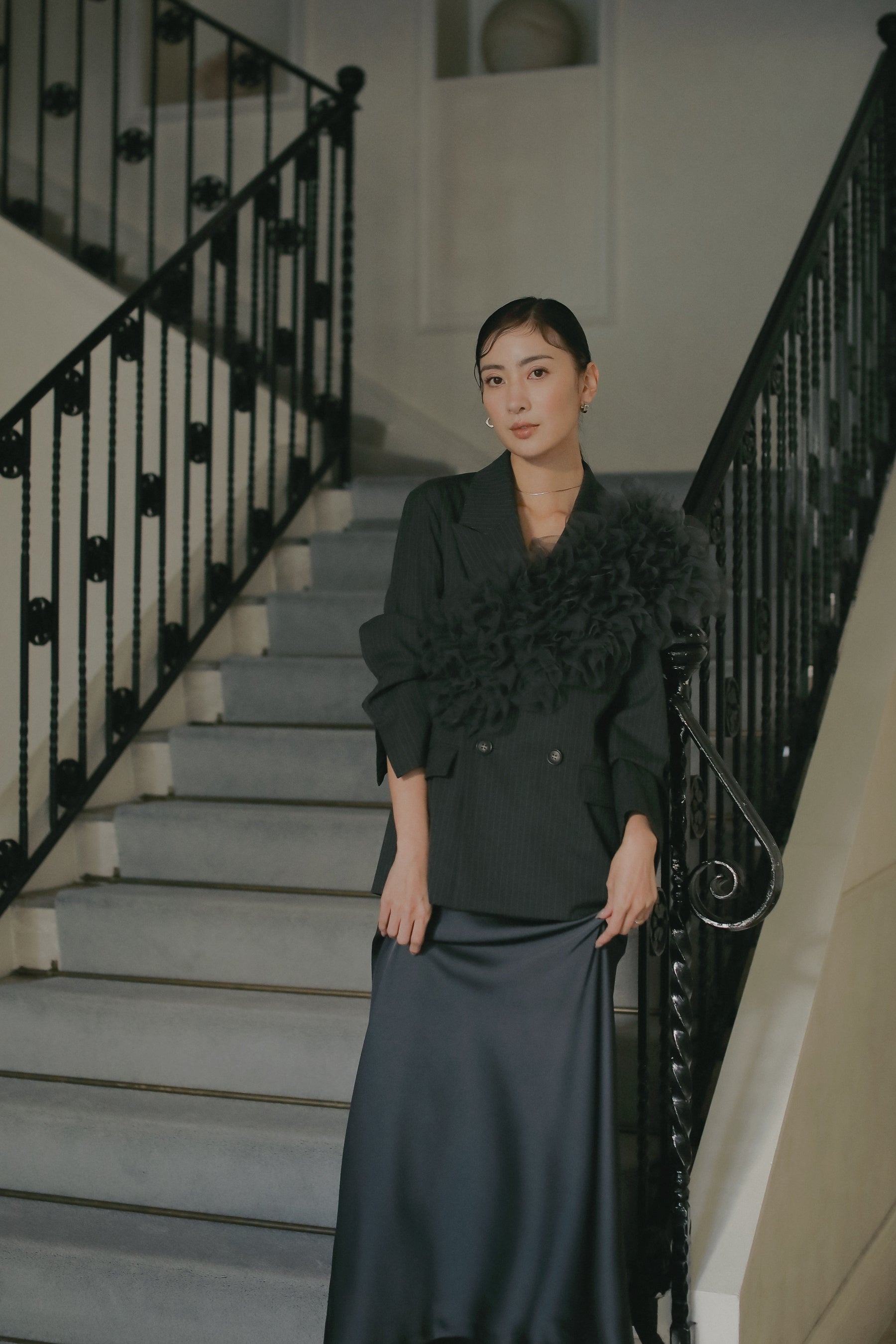肩パッドが自然と背筋を伸ばし、端正なシルエットを描く一枚。