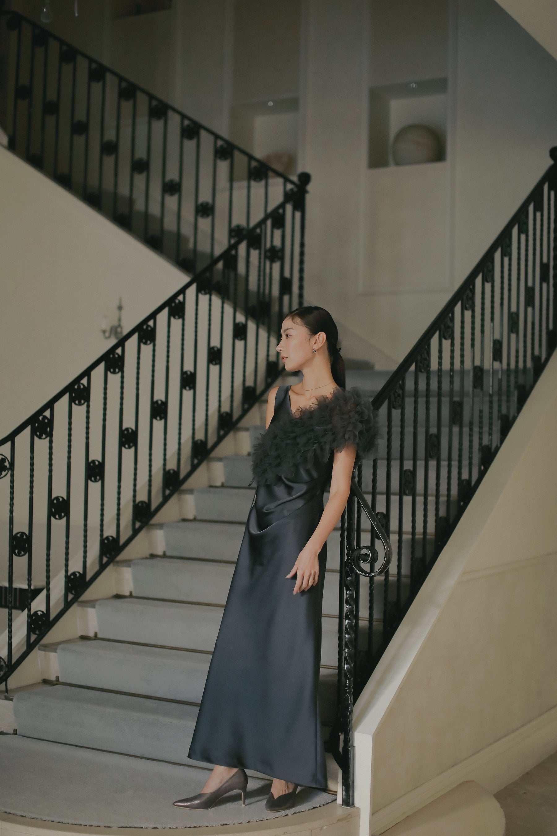 繊細なチュールとサテンの上品な艶が、大人の心をときめかせるキャミソールドレス。