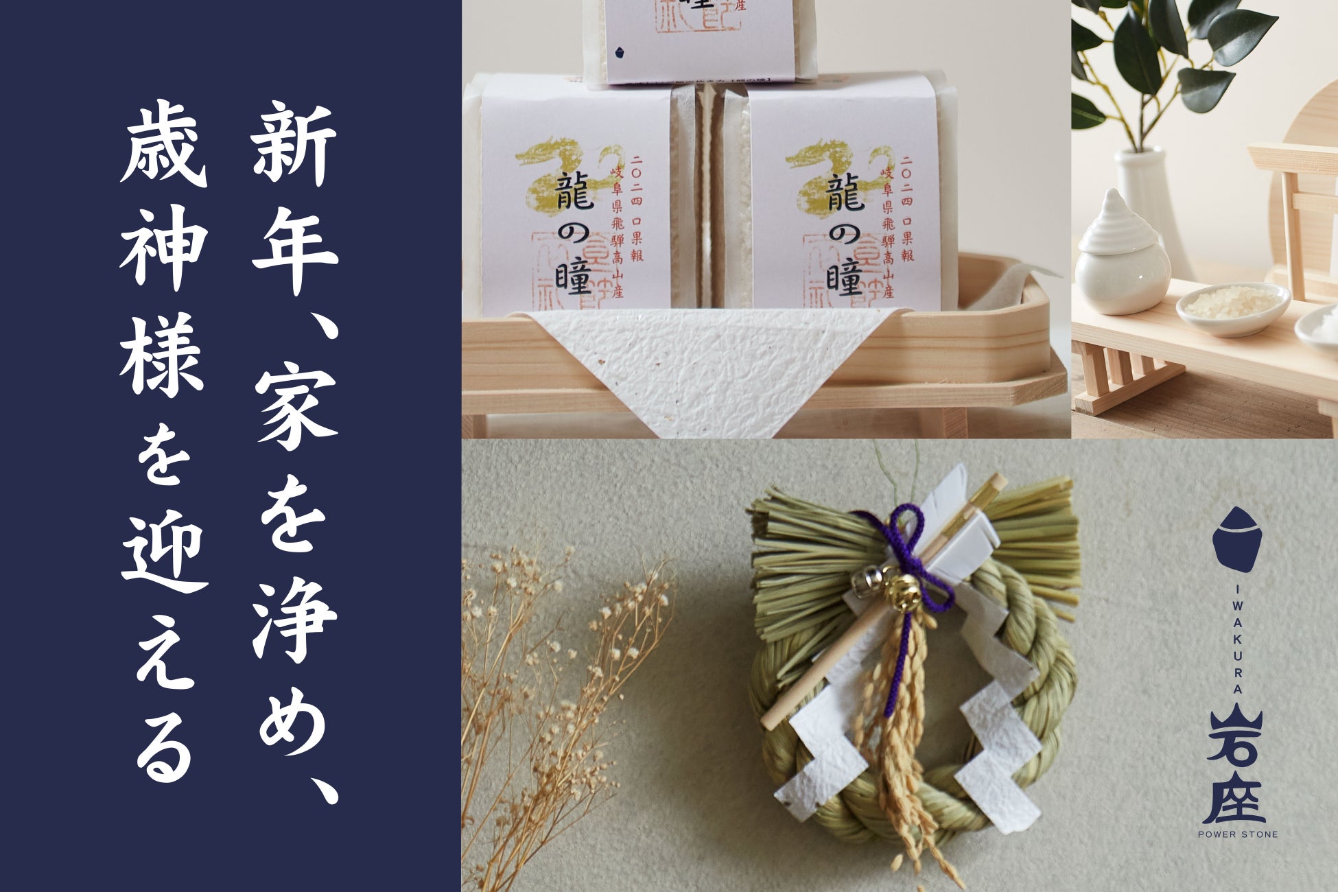 岩座 新年の迎え方 ご提案 ・干支米を発売。辰年である2024年に「龍の瞳」を神棚にお供えし、その後美味しくいただく。 ・新年のご挨拶、お年賀として干支米、龍の瞳を大事な人に贈る。 ・しめ縄の飾り方。岩座しめ縄ラインナップ紹介。 ・神棚を新調する。お札立て、破魔矢立て。 |