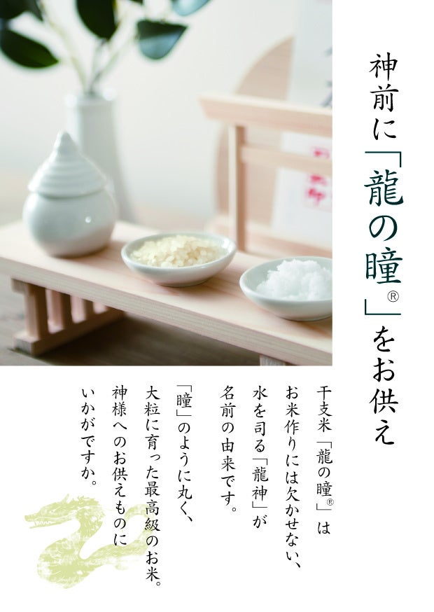 干支米「龍の瞳」は、お米作りに欠かせない、水を司る「龍神」が名前の由来です。「瞳」のように丸く、大粒に育った最高級のお米。神様へのお供えものにいかがですか。