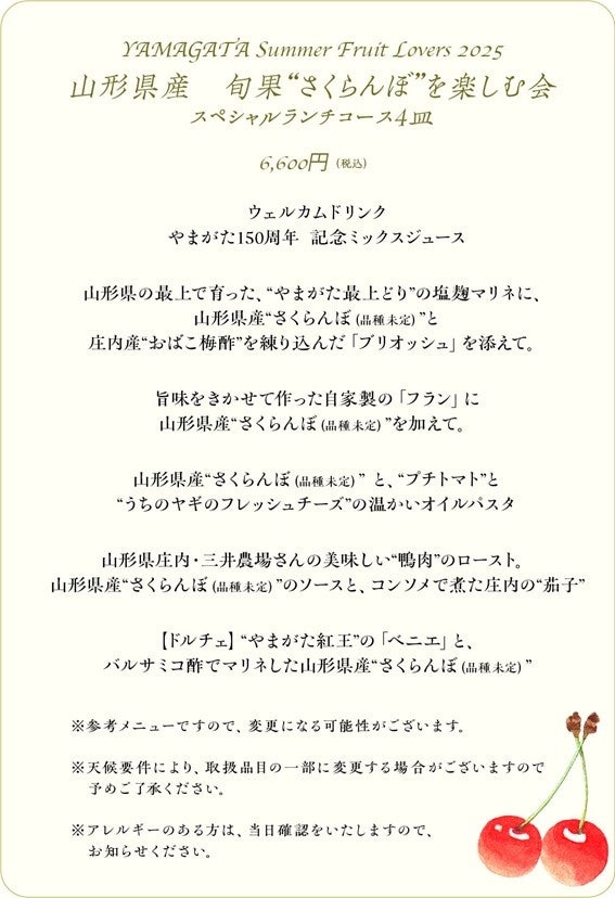 まだまだ生産量が少ない高級さくらんぼ「やまがた紅王」の他、旬のさくらんぼ(品種未定)を使ったオリジナルランチコースを、ヤマガタ サンダンデロの料理長に考案していただきました。そのほかに使っている素材も、山形県の農作物、畜産物を使ったこだわりのメニューです。