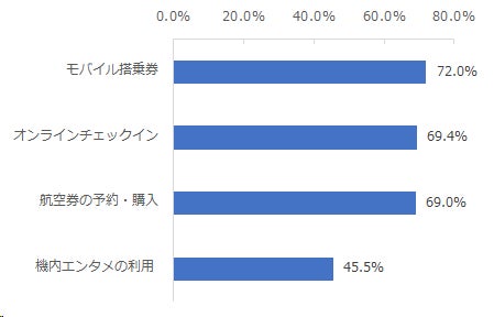 これら航空会社の公式アプリの利用者に対し、利用したことがある機能も調査したところ、最も高いのは「モバイル搭乗券」(72.0%)となり、次いで「オンラインチェックイン」(69.4%)となりました。