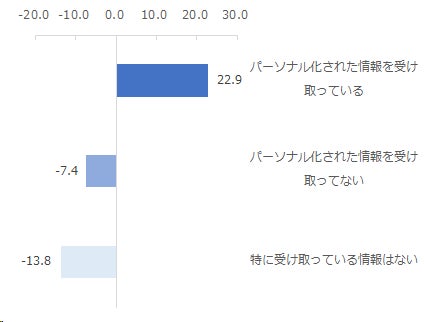 また、これらのパーソナル化された情報の受け取り有無別にNPSを分析したところ、パーソナル化された情報を受け取ったことがある利用者のNPSは22.9ポイントと高くなり、受け取っていない利用者と比較して差が開きました。過去の旅行の履歴や予約の内容に応じた利用者に最適な情報を発信できることなど、パーソナル化された情報の発信の重要性が示唆される結果となりました。