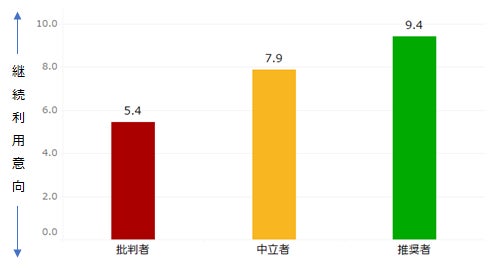該当の航空会社の利用者に対し、今後の継続利用意向を0~10の11段階でたずねたところ、 「推奨者」(推奨度が「9」~「10」の回答者)は平均9.4ポイント、「中立者」(推奨度が「7」~「8」の回答者)は平均7.9ポイント、「批判者」(推奨度が「0」~「6」の回答者)は平均5.4ポイントとなり、推奨度が高いほど継続利用意向も高くなる結果となりました。