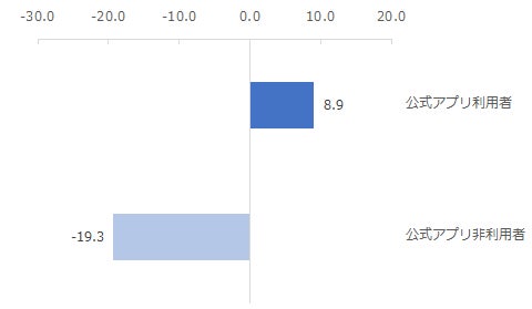 公式アプリの提供がある航空会社における公式アプリの利用率を調査したところ、30.9%が利用している結果となりました。また、公式アプリの利用有無別にNPSも分析したところ、公式アプリ利用者のNPSは8.9ポイントとなり、それ以外の利用者よりもNPSが高くなりました。