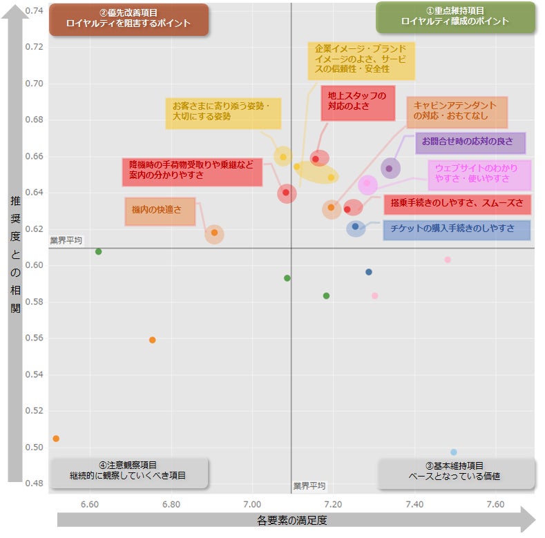 業界全体としては、搭乗手続きやチケット購入手続きのしやすさや、地上スタッフ・キャビンアテンダントの対応のよさのほか、企業やブランドイメージの良さやサービスへの信頼性、またウェブサイトのわかりやすさもロイヤルティ醸成につながりました。