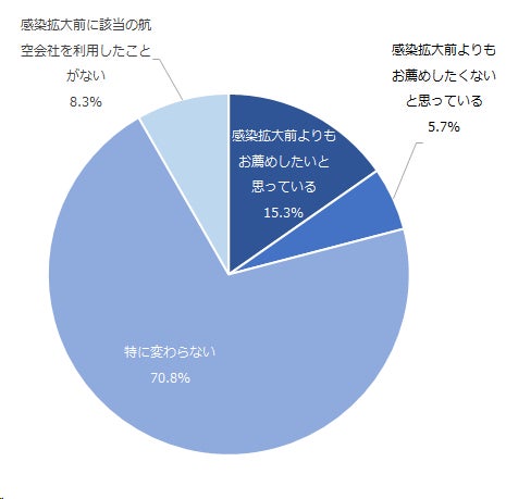 新型コロナウイルスの感染拡大前(2020年1月以前)と比較してお薦めしたいという思いに変化があったか調査したところ、「新型コロナウイルスの感染拡大前よりもお薦めしたいと思っている」と回答した利用者は15.3%となりました。
