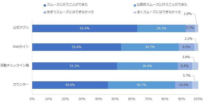 また、搭乗に必要なチェックインについて、手続きをスムーズに行うことができたかどうかを手段別に調査したところ、公式アプリ経由でチェックインした利用者では「スムーズに行うことができた」と回答した割合は63.4%となり、公式アプリ利用者は、他の手段の利用者よりもチェックインがスムーズにできている傾向がみられました。チェックインをはじめとした手続きをアプリでスムーズに提供することが、シームレスな顧客体験を生み、利用者の利便性を高め、ロイヤルティの向上にもつながることがうかがえる結果となりました。