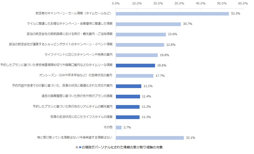航空会社のWebサイトや、アプリ・メルマガを利用した経験がある回答者に対し、航空会社が発信する情報について受け取ったことがあるか調査をしたところ、受け取った割合が最も高かったのは「航空券のキャンペーン・セール情報(タイムセールなど)」(53.3%)となりました。次いで「マイルに関連したお得なキャンペーン・会員優待に関連した情報」(30.7%)、「該当の航空会社の就航路線における旅行・観光案内・ご当地情報」(23.6%)と続きました。
