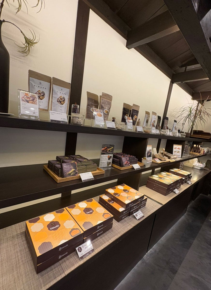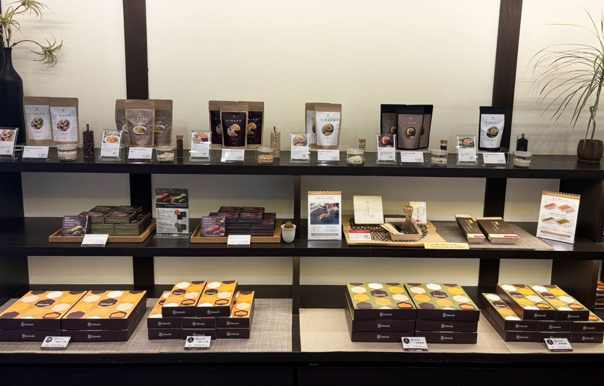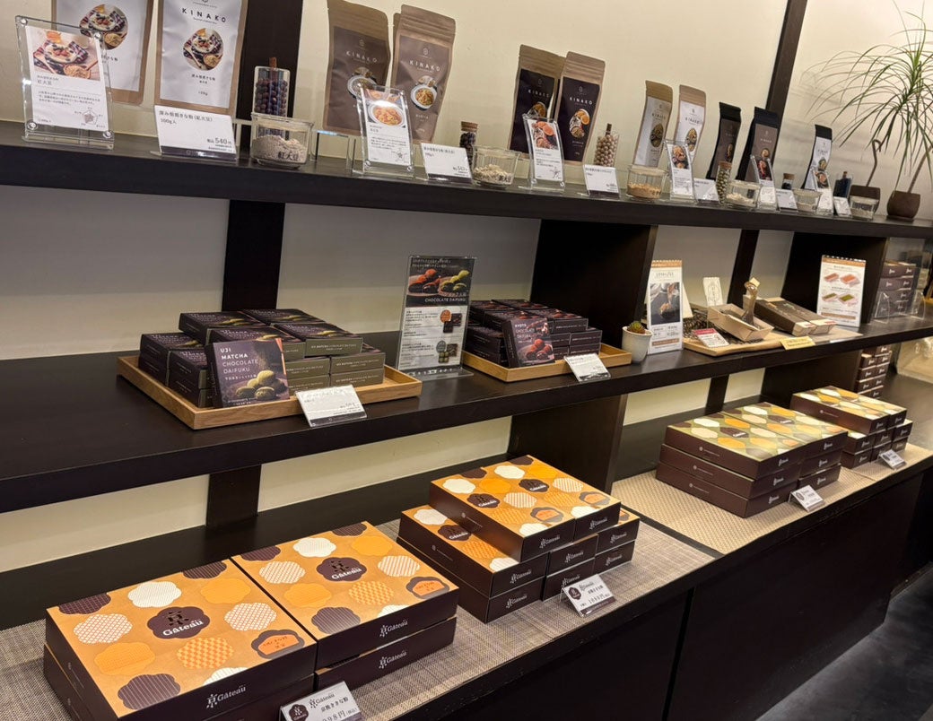 自家焙煎きな粉や抹茶を使ったお菓子が揃う物販コーナー