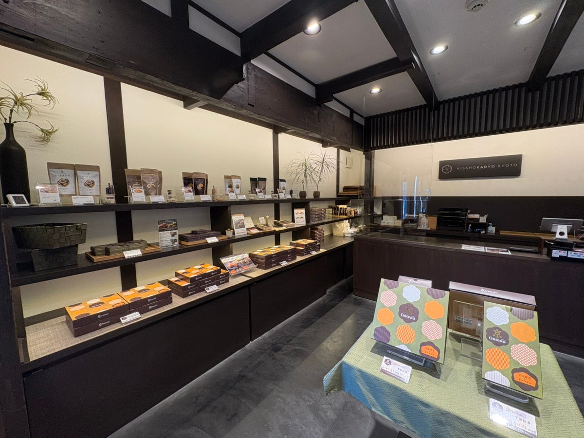 吉祥菓寮祇園本店の1階は、こだわりのスイーツをお買い求めいただける物販スペースとなっております。看板商品の深み焙煎きな粉やわらびもち、お日持ちのするきな粉や抹茶をふんだんに使用した焼き菓子を取り揃えております。カフェで味わった感動をご自宅でも。京都観光のお土産や大切な方への贈り物にも最適です。