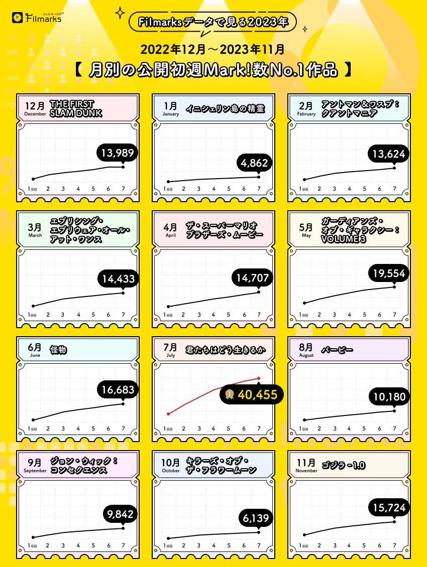 中でも『君たちはどう生きるか』は7日間で4万Mark!を突破。2023年の公開初週の獲得Mark!数、第1位となりました。