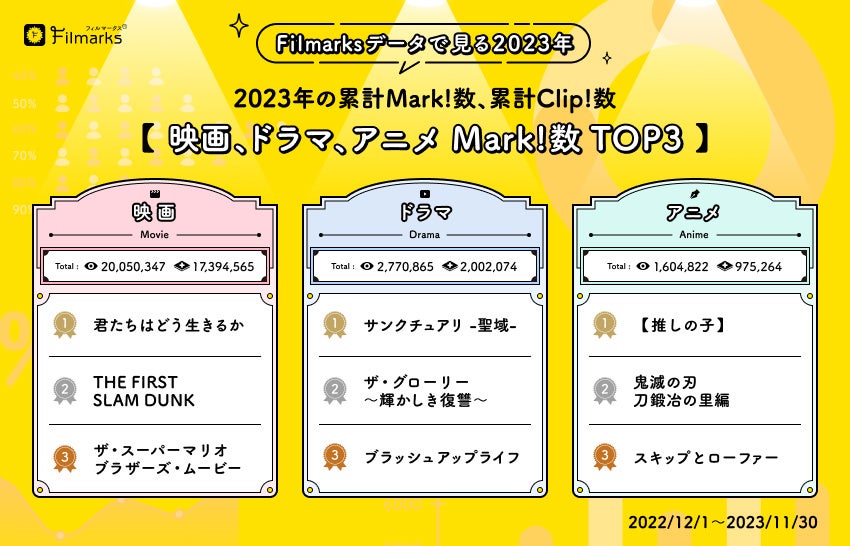 国内最大級の映画やドラマ、アニメのレビューサービス「Filmarks(フィルマークス)」が「Filmarksデータで見る2023年」を公開