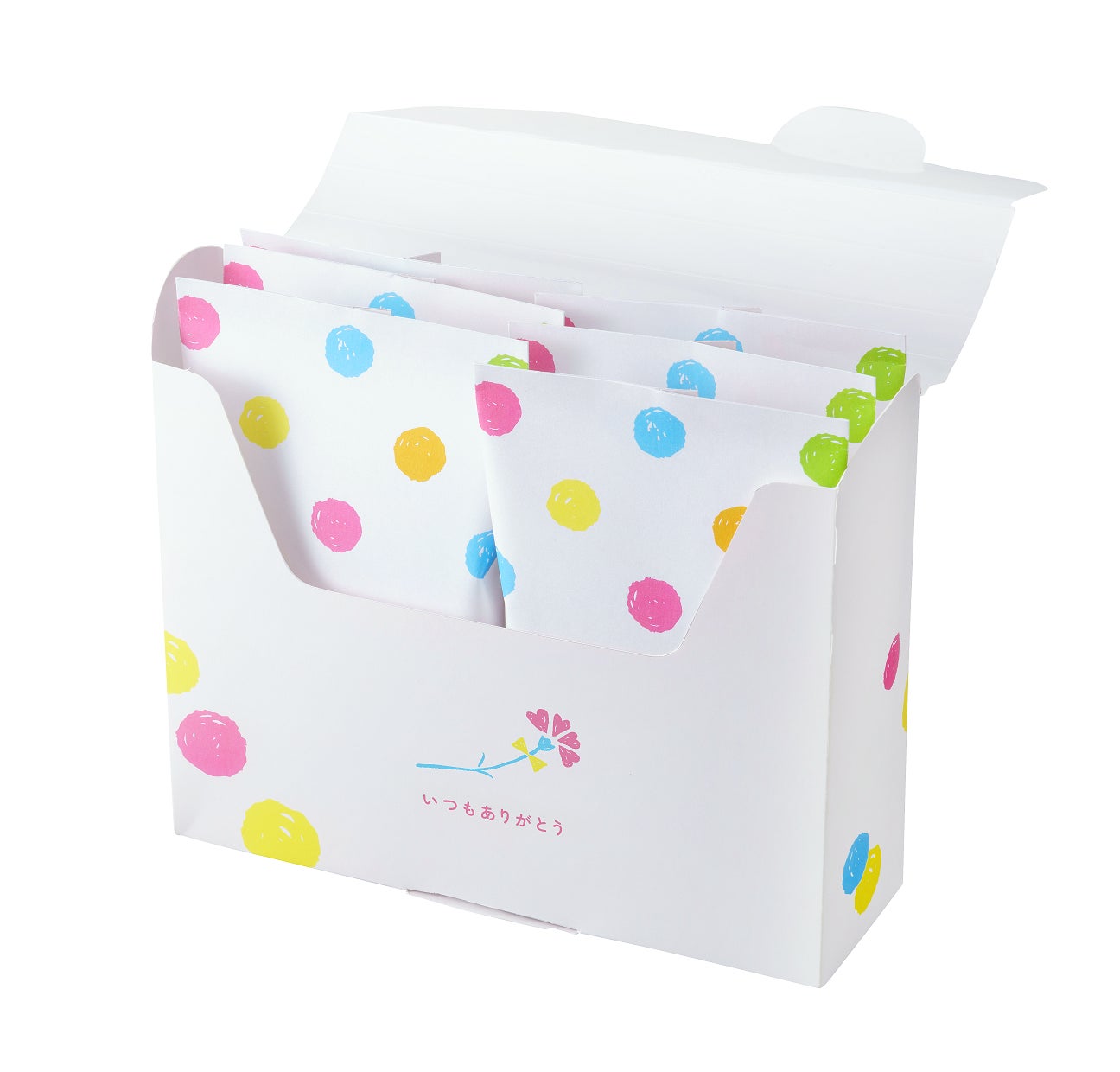 「母の日限定パッケージ」は、外箱のラムネを配したデザインの一部をハート型にし、箱を開けるとカーネーションのイラストと「いつもありがとう」のメッセージで、感謝の気持ちを彩ります。オリジナルデザインのショッパー(紙袋)をお付けしてお届けします。