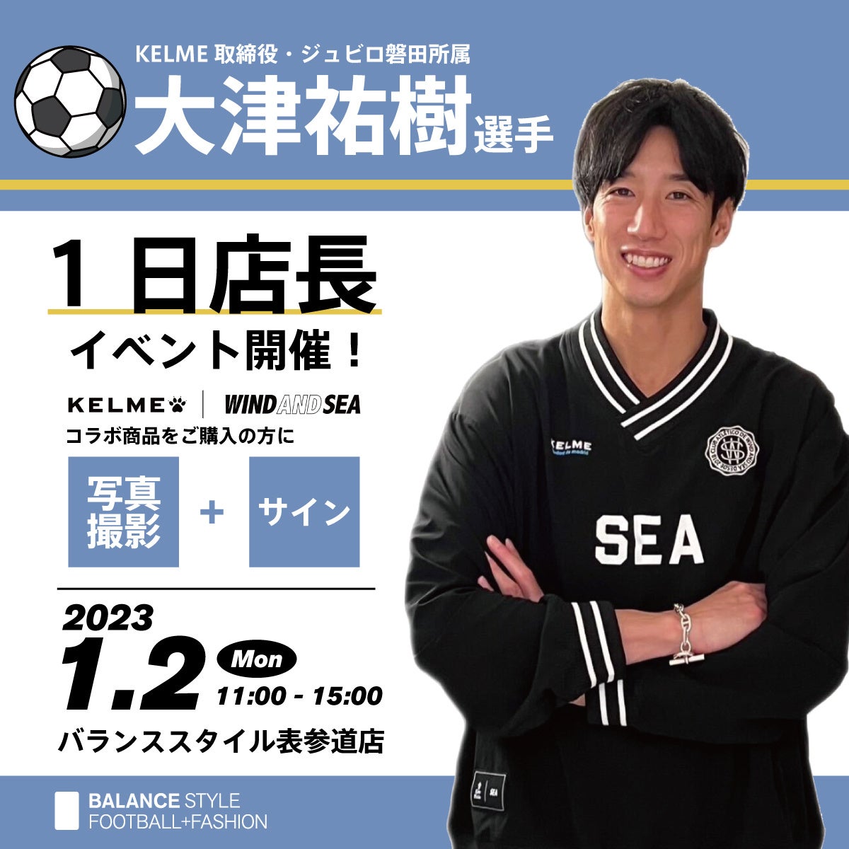 2023年1月2日(月)11時〜15時に「KELME x WIND AND SEA」のコラボアイテムをご購入していただいた全てのお客様がイベントに参加可能。大津祐樹選手と写真撮影、そして直筆サイン(購入品でも持参物でも可)のファンサービスを行う予定です。