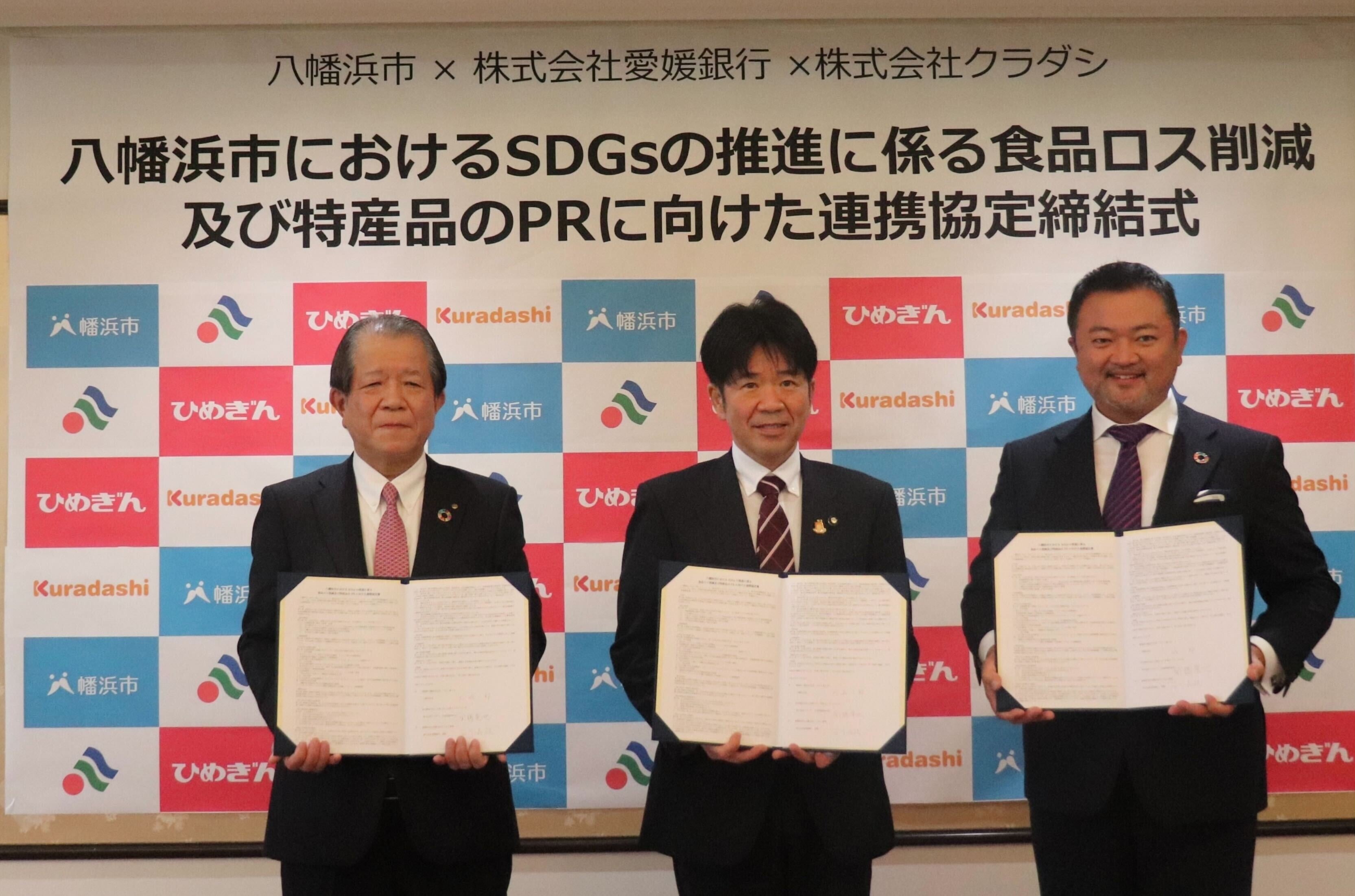 ソーシャルグッドマーケット「Kuradashi」を運営する株式会社クラダシ(本社:東京都品川区、代表取締役社長:関藤竜也、以下「クラダシ」)は、愛媛県八幡浜市(市長:大城一郎)、株式会社愛媛銀行(本社:愛媛県松山市、頭取:西川義教、以下「愛媛銀行)と3者で「八幡浜市におけるSDGsの推進に係る食品ロス削減及び特産品のPRに向けた連携協定」を締結いたしました。八幡浜市の柑橘産業のさらなる発展と地域の活性化を目指します。