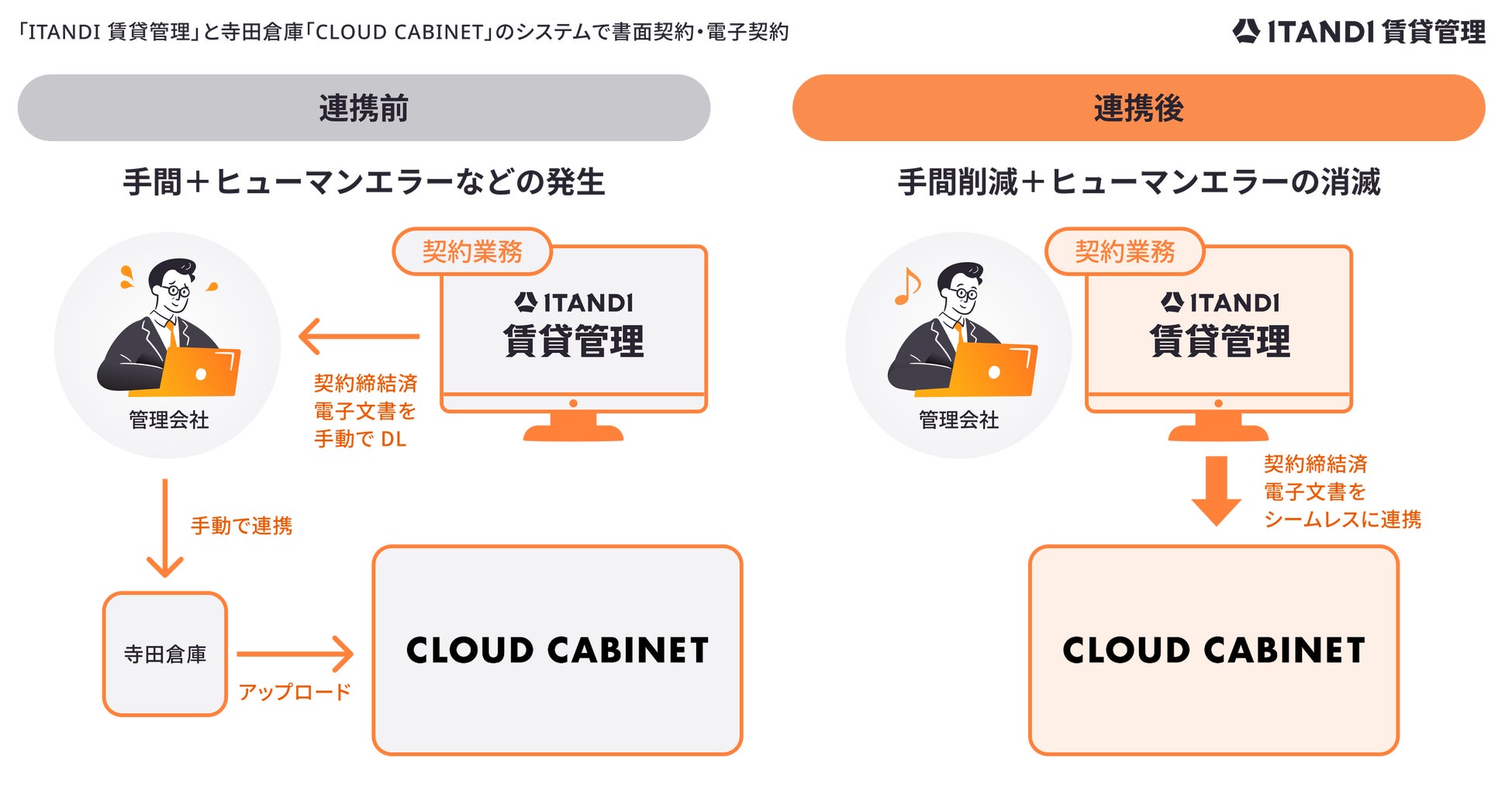 コスモスイニシア、イタンジ「ITANDI 賃貸管理」の電子契約データと寺田倉庫「CLOUD CABINET」の連携を開始