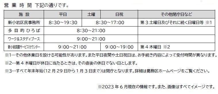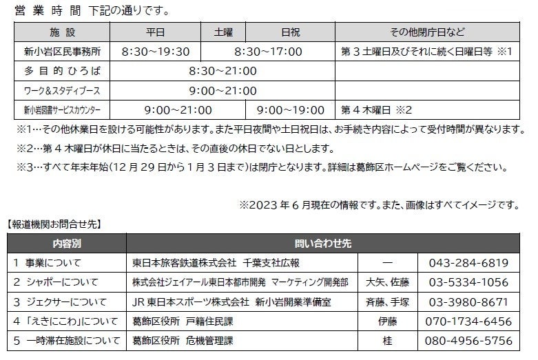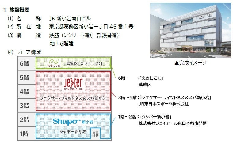 ○ 1階~2階には商業施設「シャポー新小岩」、3階~5階にはスポーツ施設「ジェクサー・フィットネス&スパ新小岩」、6階には葛飾区行政サービス施設「えきにこわ」がオープンします。