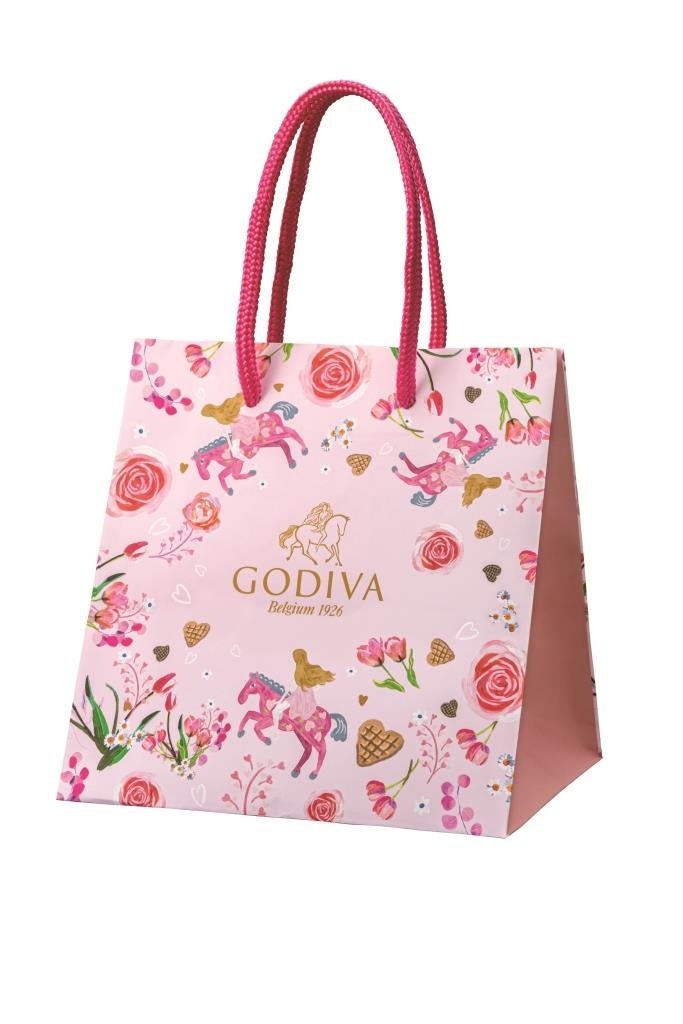 レディ・ゴディバ、フラワー、ハート形のワッフルなど、コレクションを象徴するモチーフを散りばめたギフトバッグ。大切な方へ贈り物をお渡しする際にご利用ください。