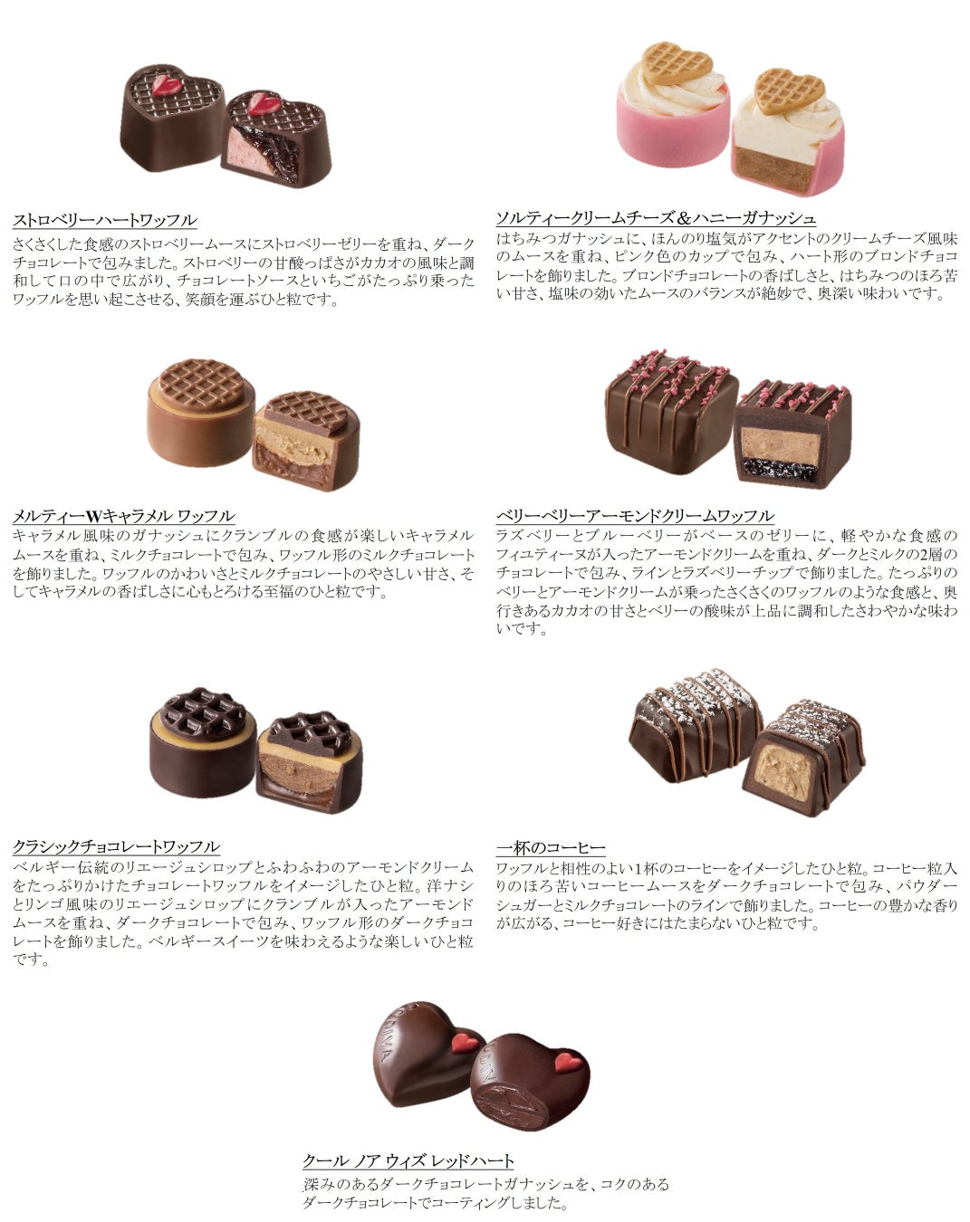 コレクションの限定チョコレートは、チョコレートソースといちごがたっぷり乗ったワッフルを思い起こさせる「ストロベリーハートワッフル」や、はちみつガナッシュとクリームチーズ風味のムースを重ねた「ソルティークリームチーズ&ハニーガナッシュ」など、7種類と、カレタイプのチョコレート2種類です。