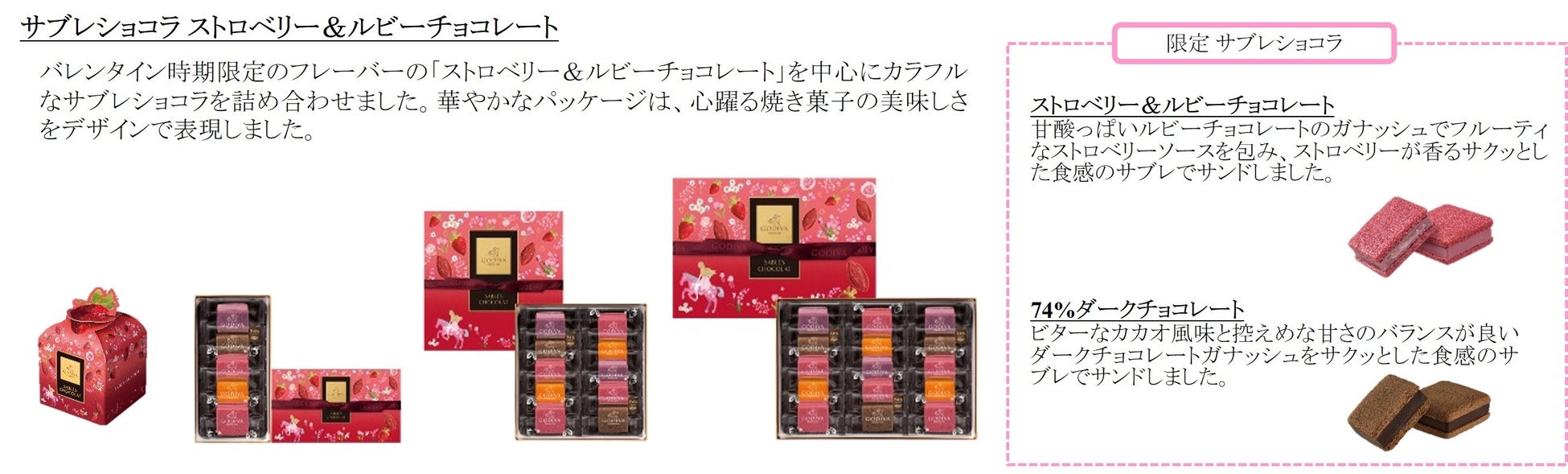 バレンタイン限定の焼き菓子には、新フレーバー「ストロベリー&ルビーチョコレート」が加わったサブレショコラや、「ドーム バームクーヘン ショコラノワール & ショコラブラン」、ハート形の「ガトー オ ショコラ」、サクッとした食感の「クリスピーワッフルサンド」などを取り揃えました。