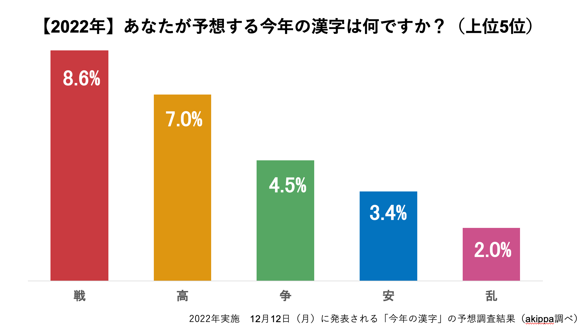 【12月12日(月)に発表される「今年の漢字」の予想調査結果】akippaユーザーに一番多かった回答は「戦」