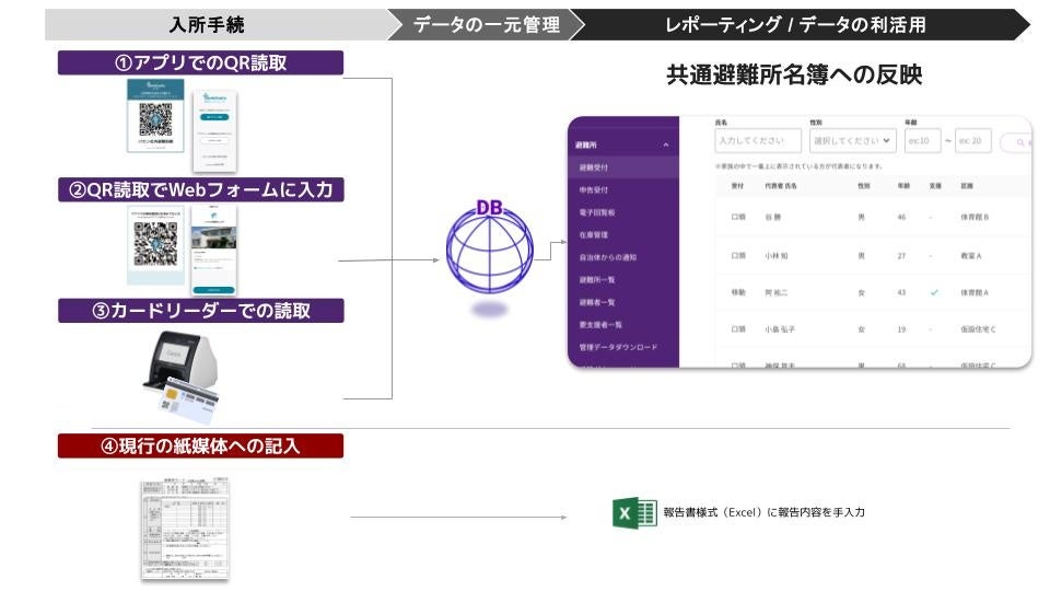 従来の紙の避難者カードへの記入を、アプリ※やマイナンバーカードリーダー、WEBフォームへの入力によってデジタル化し、避難者の入所受付開始から避難者名簿の集約、避難所状況報告までの所要時間の検証を行った。