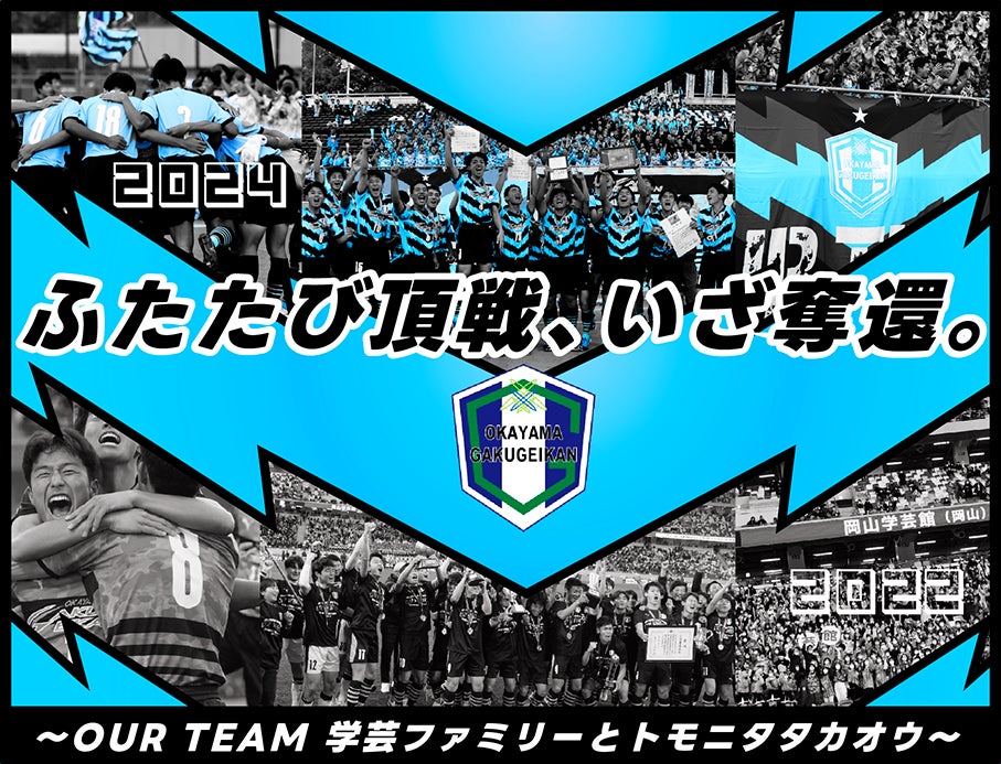 岡山学芸館高校サッカー部の歴史を塗り替え、学芸ファミリーの人生をかえてくれた「全国制覇」から2年。先輩たちの偉業を誇りに思いつつも、勝って当たり前の目に見えぬ厳しいプレッシャーの中、目の前の一つ一つの試合に集中しチャレンジ精神で、全国高校サッカー選手権への出場権を得ました。もう一度、”頂(いただき)”にのぼり、学芸ファミリーで感動を分かち合いたいと本気で思っています。