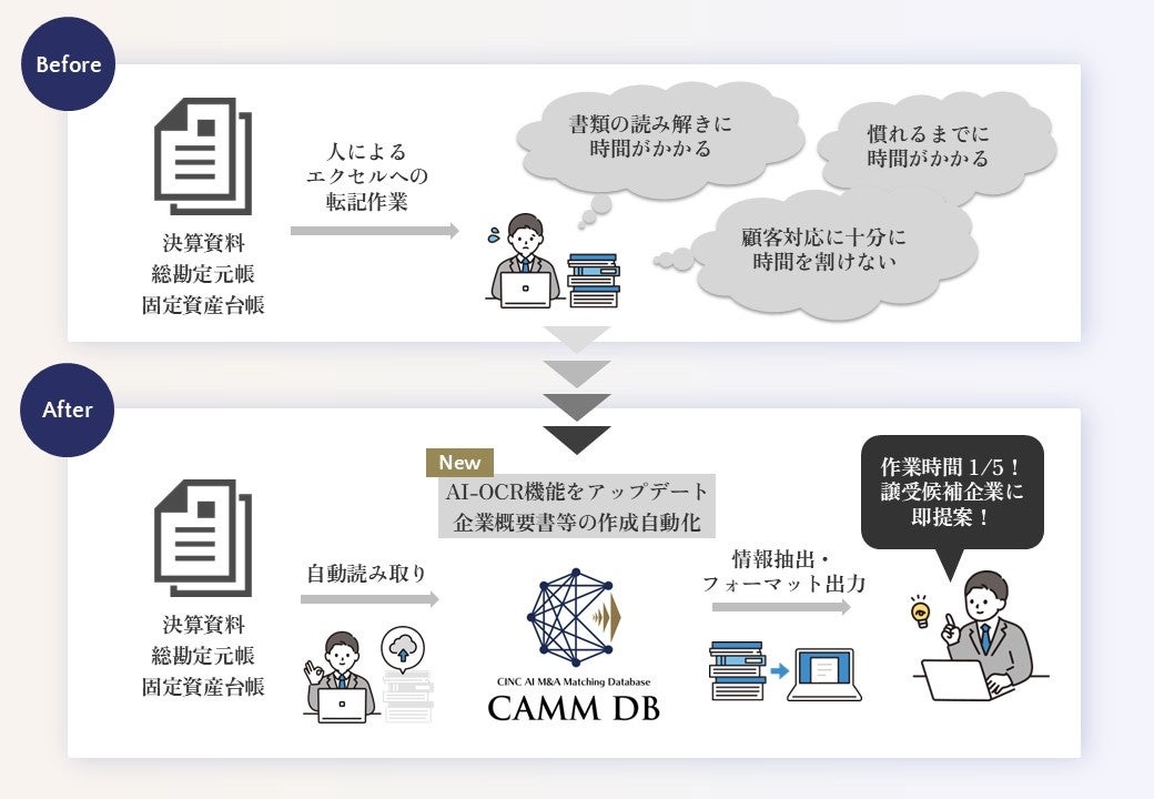 株式会社CINC(本社:東京都港区、代表取締役:石松友典、以下CINC)の子会社である株式会社CINC Capital(所在地:東京都港区、取締役 執行役員社長:阿部泰士、以下CINC Capital)は、CINCの持つデータ収集技術やデータ分析の知見を活かしたM&A仲介事業を実現すべく、事業開始当初よりシステムの開発に注力しています。今回は、生成AIを活用した社内用M&A仲介マッチングシステム「CAMM DB(キャムディービー)」に搭載されているOCR機能をアップデートしました。決算資料・総勘定元帳・固定資産台帳から、資料作成に必要な情報を最適なフォーマットで出力、対象企業の企業概要書などの資料を自動で作成できるようになりました。これにより、譲渡検討企業1社あたりの資料作成に要する時間が1/5に削減できる見通しです。