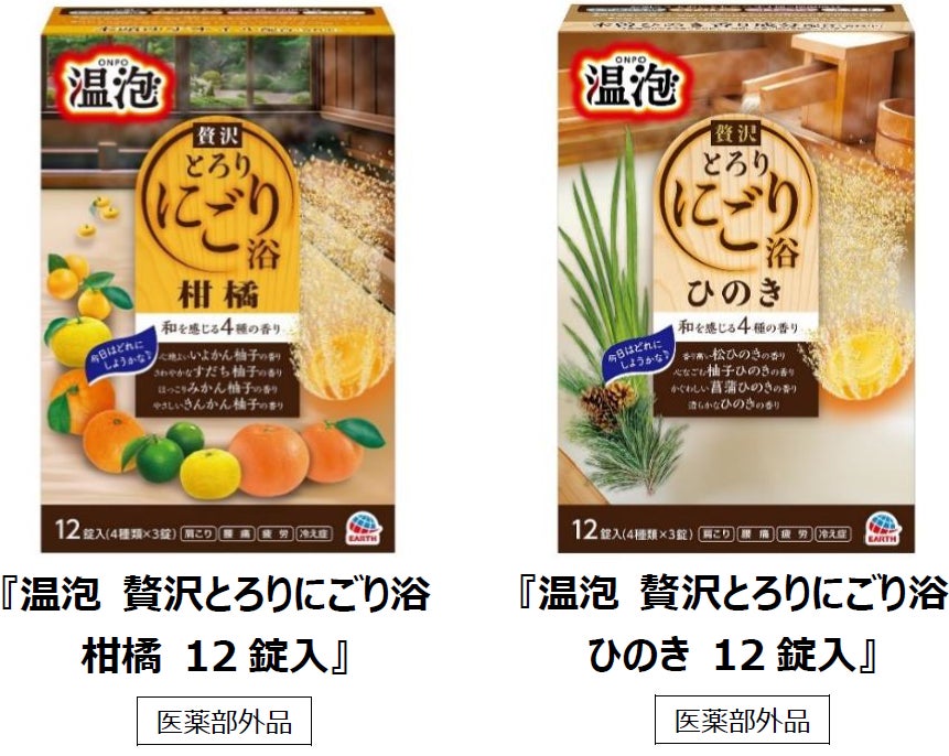 今回発売した本製品は、贅沢感のある和の香りと、温もり感のある「にごり湯」、「とろみのある、なめらかな湯ざわり」により、おうちのお風呂を隠れ家温泉※1のような空間に演出し、非日常感を味わえます。『温泡 贅沢とろりにごり浴 柑橘』には、徳島県産の木頭ゆずオイルを、『温泡 贅沢とろりにごり浴 ひのき』には、木曽産のひのきの香りを分析し、再現した香り成分を香料中に配合しています。アース製薬独自の「アロマキープ処方」を採用し、入浴時に、柑橘やひのきの香りを長くお楽しみいただけます。