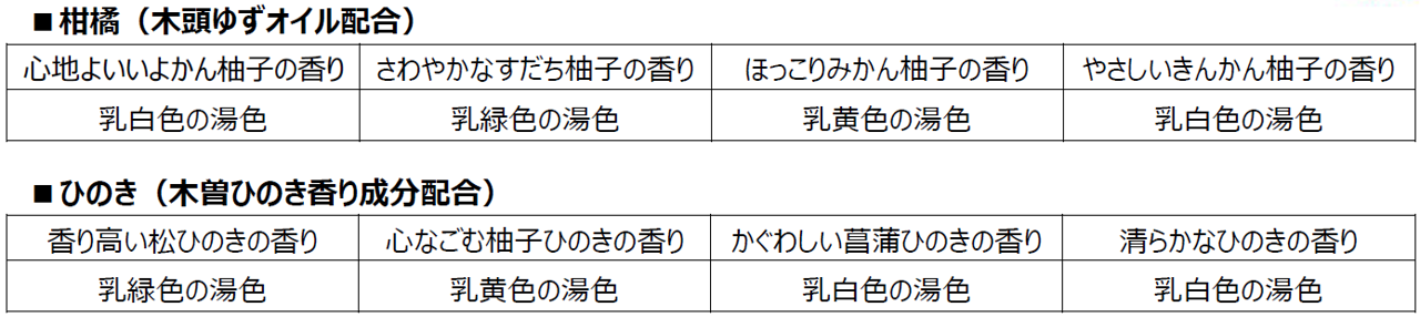 ②バスアースULH-5(香り高い松ひのきの香り、心なごむ柚子ひのきの香り、かぐわしい菖蒲ひのきの香り、清らかなひのきの香り)