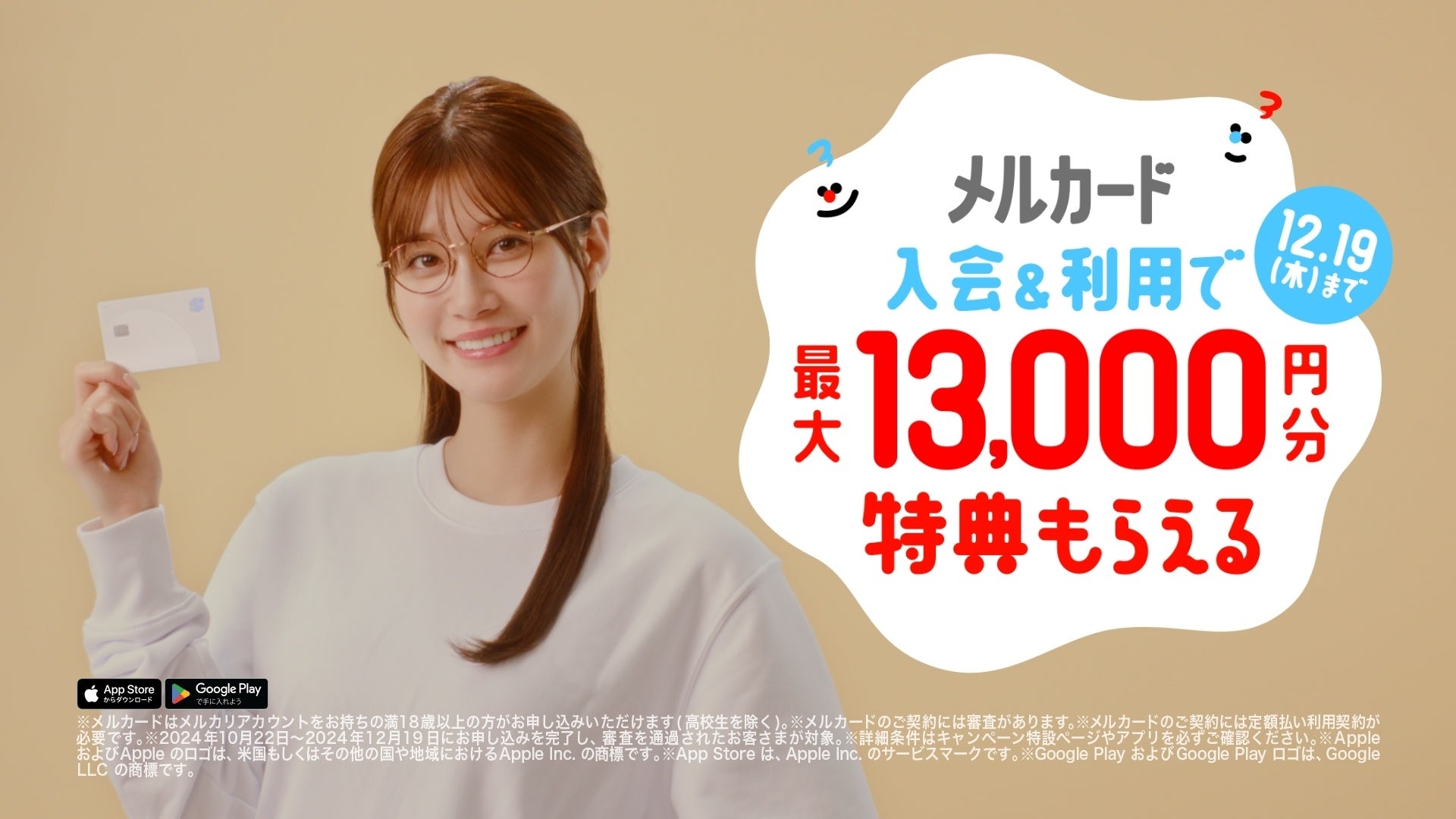 株式会社メルペイ(以下、メルペイ)は、2024年10月22日より、「メルカード」の新規入会や利用で最大13,000円分の特典がもらえるキャンペーンを開催いたします。また、キャンペーン開始に伴い、翌23日より生見愛瑠さんが出演の新CM『メルカード「もってないともったいない」篇』を放映いたします。