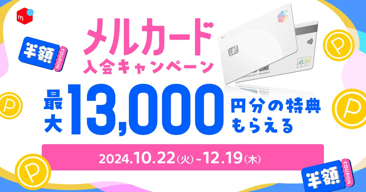 今後さらに多くのお客さまに「メルカード」を活用してお得に「メルカリ」での売買や、お店でのお買い物を楽しんでいただくため、「メルカード」の新規入会・利用で最大13,000円分の特典がもらえるキャンペーン(※6)を開催いたします。「メルカリ」でのお買い物に使える半額クーポン(上限4,000円×1枚、上限1,000円×2枚)や、全国のお店でメルカードを1回使うごとに1,000ポイントが最大3回もらえる特典などをご用意しています(税込300円以上のご利用が対象)。また「メルカリ」でのお買い物に使える半額クーポンの有効期限は、キャンペーンが終了する2024年12月19日より1年間の2025年12月18日までとしています。