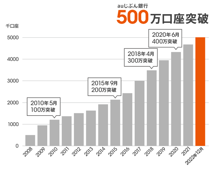 auじぶん銀行株式会社(本社:東京都中央区、代表取締役社長:石月 貴史、以下 auじぶん銀行)は、2022年12月12日時点での預金口座数(注1)が500万口座を突破しました。
