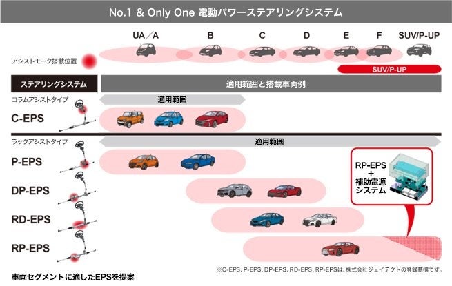 ジェイテクトは1988年に世界で初めてEPSを開発・量産を開始して以来、現在に至るまで世界シェアNo.1*であり、全てのアシストタイプのEPSを提供できるOnly Oneのステアリングシステムサプライヤーです。