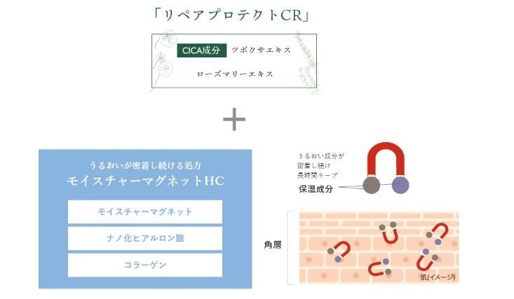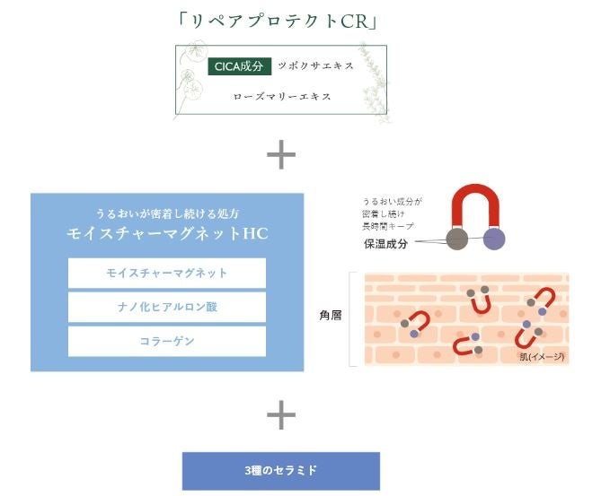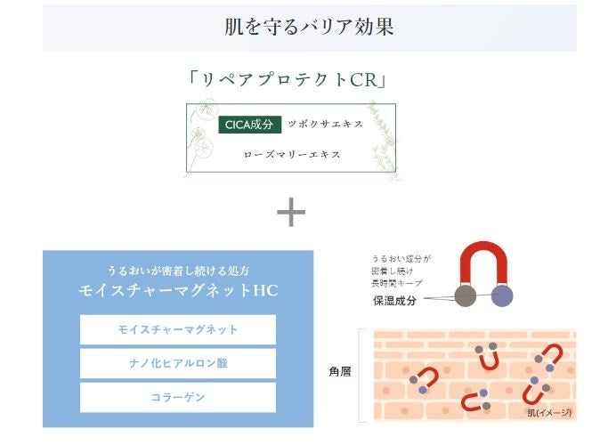 ・うるおいが密着する独自処方「モイスチャーマグネットHC」、独自成分「リペアプロテクトCR(ツボクサエキス+ローズマリーエキス)」、その他保湿成分が、肌を守りながらうるおいを与えます。