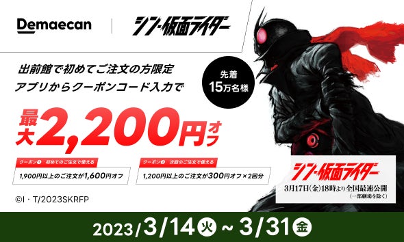 『出前館』を初めてご利用する先着15万名さまに、『出前館』×『シン・仮面ライダー』のコラボクーポンを配布