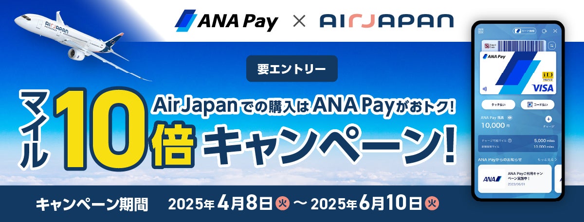 ANA X株式会社(代表取締役社長:神田 真也、本社:東京都中央区)と、株式会社エアージャパン(代表取締役社長:峯口 秀喜、本社千葉県成田市)は、2025年4月8日(火)~2025年6月10日(火)の期間、「AirJapanの航空券購入はANA Payがおトク!マイル10倍キャンペーン!」を実施いたします。
