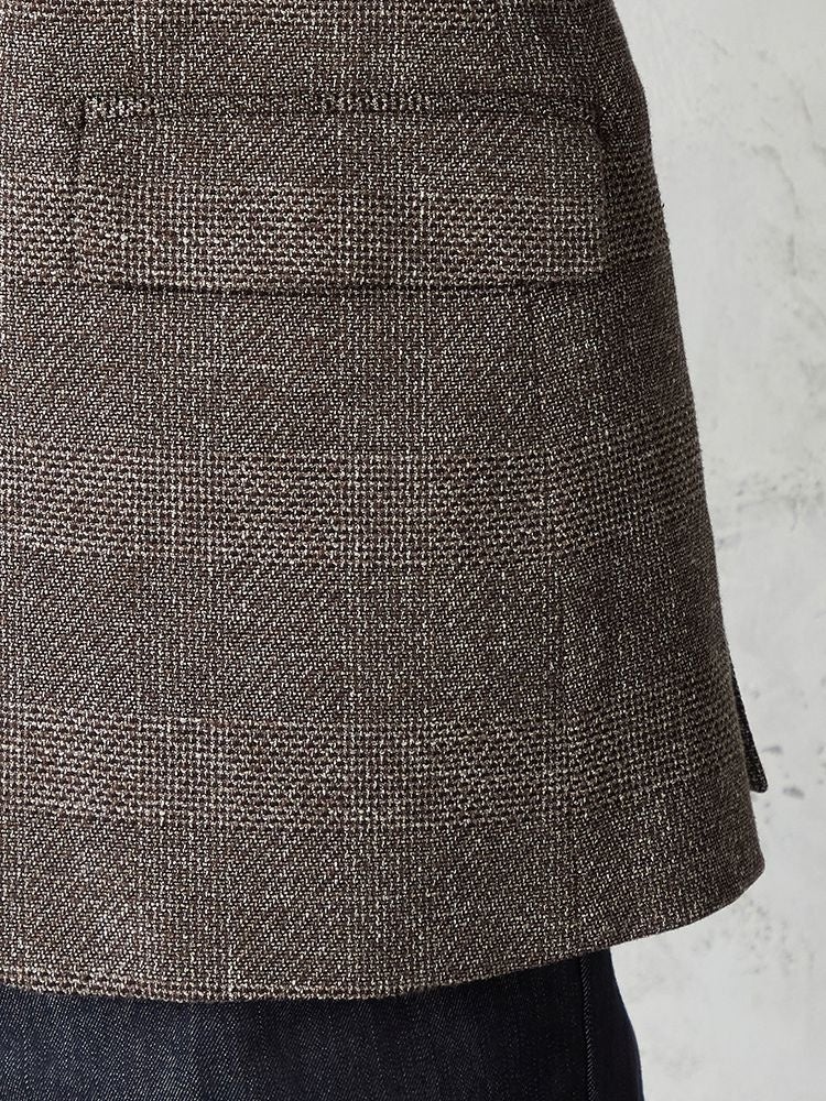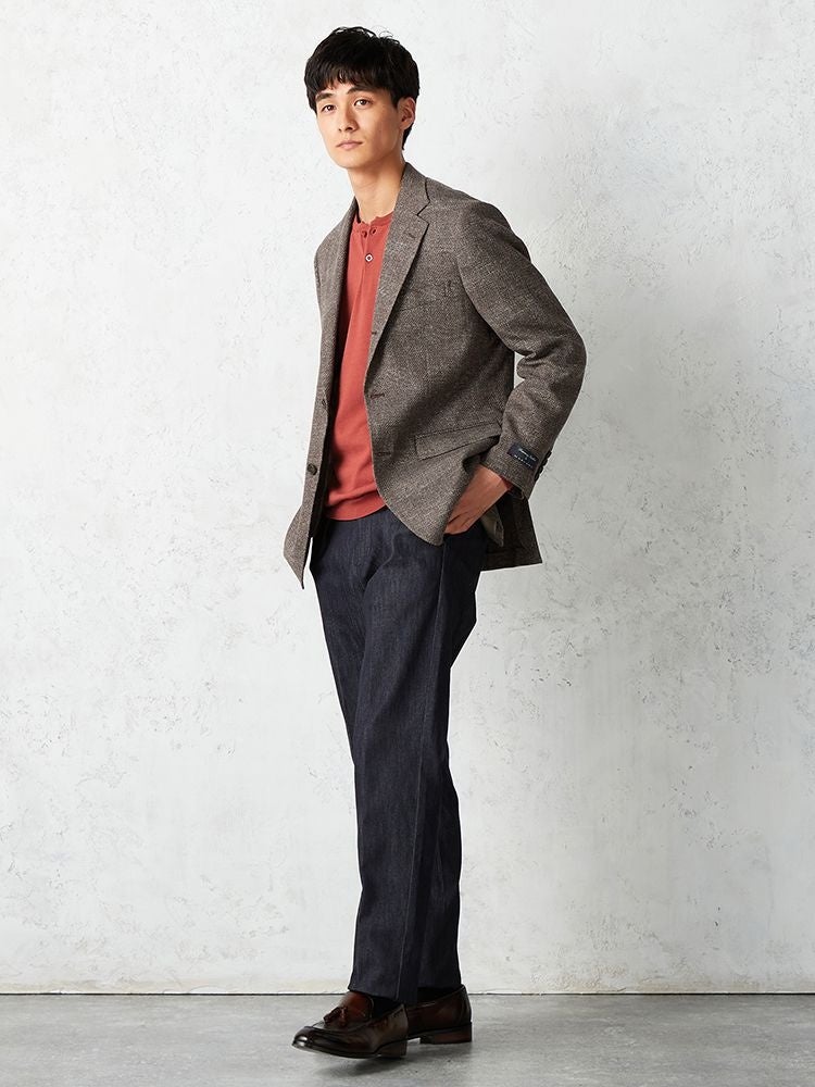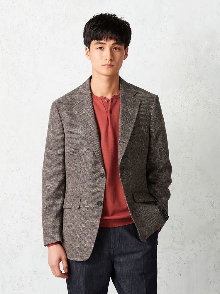 コットンリネン素材とニットのような柔らかく軽い生地が春夏らしい涼しげなジャケットです。ニュアンスブラウンのカラーが馴染みやすくスタイリングに取り入れやすい大人なデザインに、AMFステッチや袖口本切羽仕様など細部にこだわり、高級感のある仕上がりとなっております。デニムなどのカジュアルパンツとも相性良く、オンオフ問わず着回せる一着です。