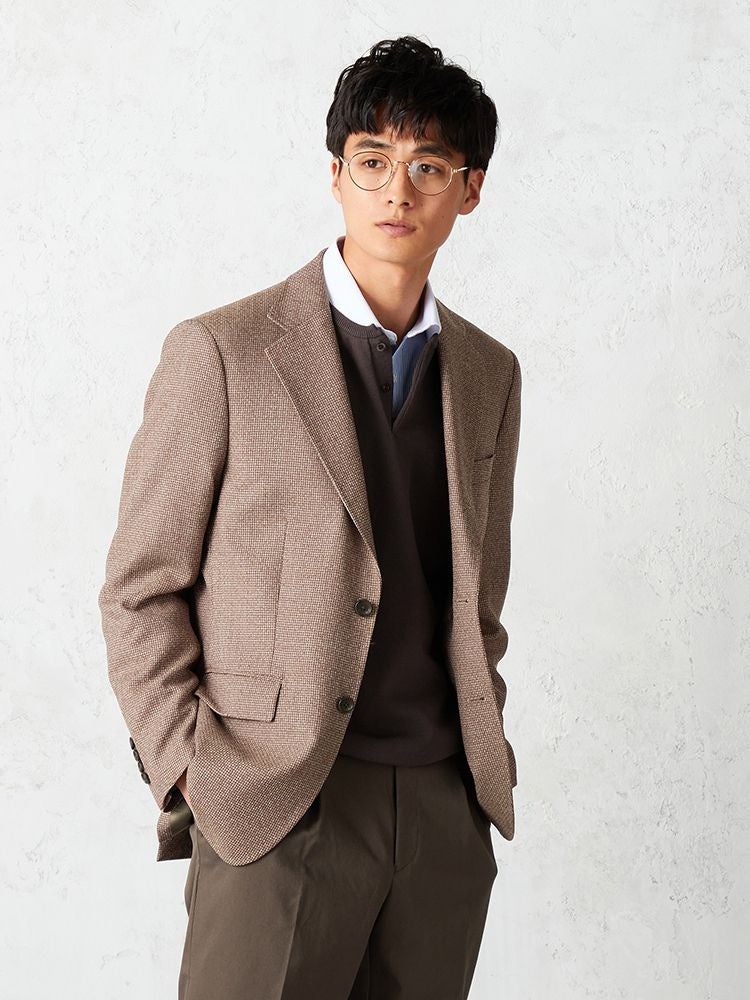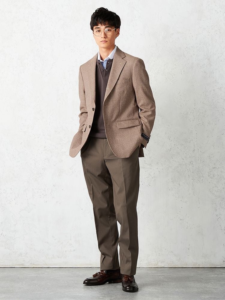 サマーウール素材を使用し、ざっくりと織られたバスッケト織の爽やかさにオレンジ系カラーがアクセントになった新鮮さのある一着で、コーディネートの差し色にオススメです。オレンジの色味にこだわり、ベージュの糸と掛け合わせることでナチュラルなトーンを実現し、オフィスカジュアルのスタイリングに取り入れやすい仕様にしました。AMFステッチや袖口の本切羽仕様など細部は高級感にこだわったデザインを取り入れました。